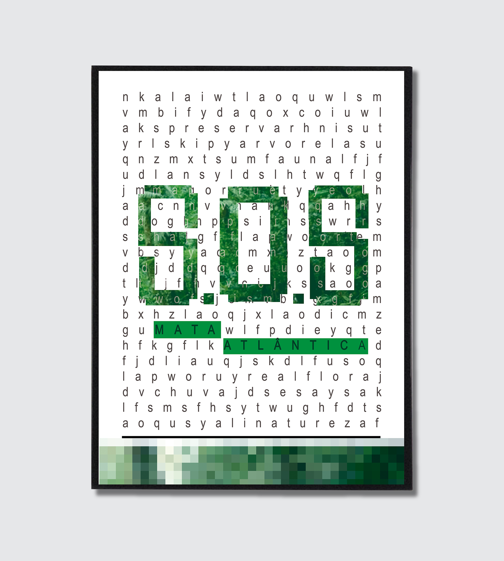 O objetivo é divulgar o trabalho do S.O.S Mata Atlântica, organização brasileira, sem fins lucrativos, que tem como missão inspirar a sociedade na defesa da Mata Atlântica. Para isso, foi utilizado o clássico jogo de caça palavras, resultando em um cartaz impactante, divertido e capaz de gerar engajamento.